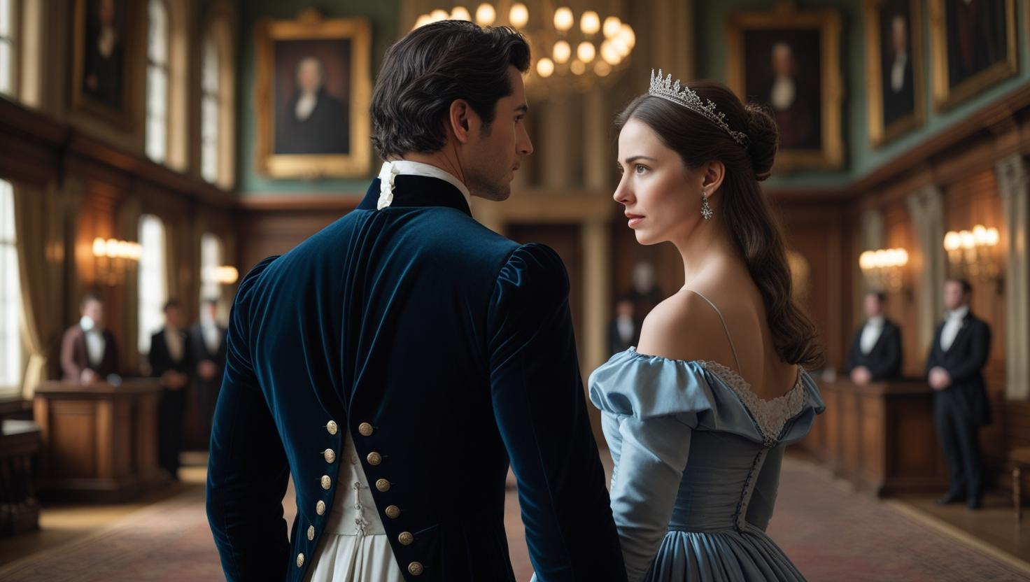 The question landed like a pebble thrown into a calm pond; the ripples moved through the surrounding guests. Anne looked from Harcourt to William, and in Wiiliam’s face she saw a heat that was more fury than injury. He hated this man. His hand tightened at her waist, then relaxed as if testing a dam that might not hold.